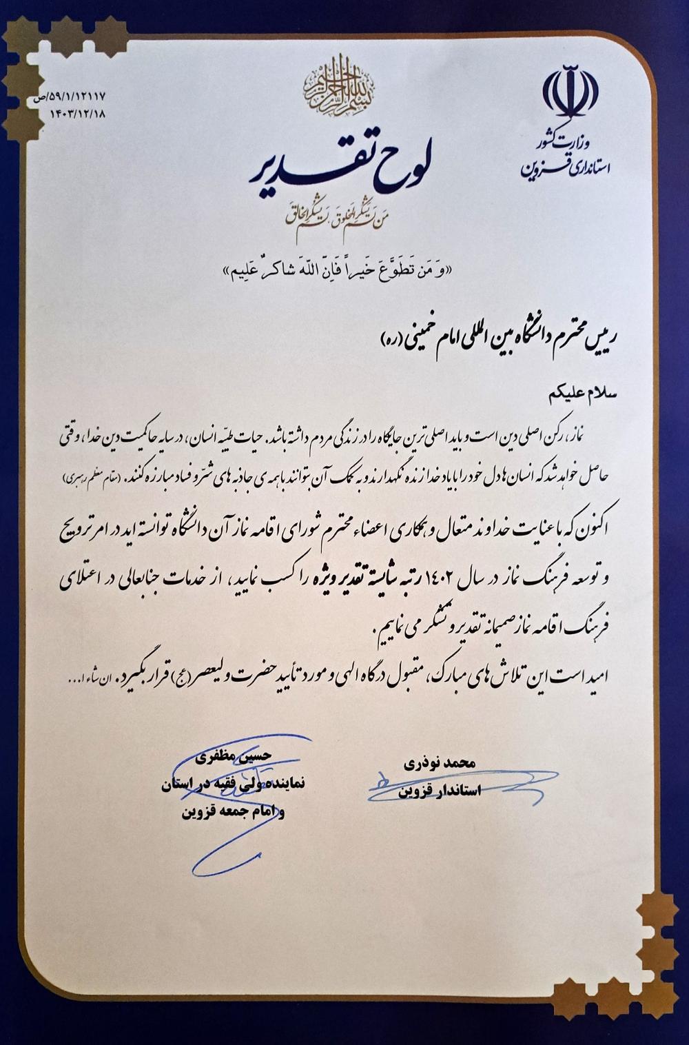 قدردانی ستاد اقامه نماز استان از دانشگاه بینالمللی امامخمینی(ره)